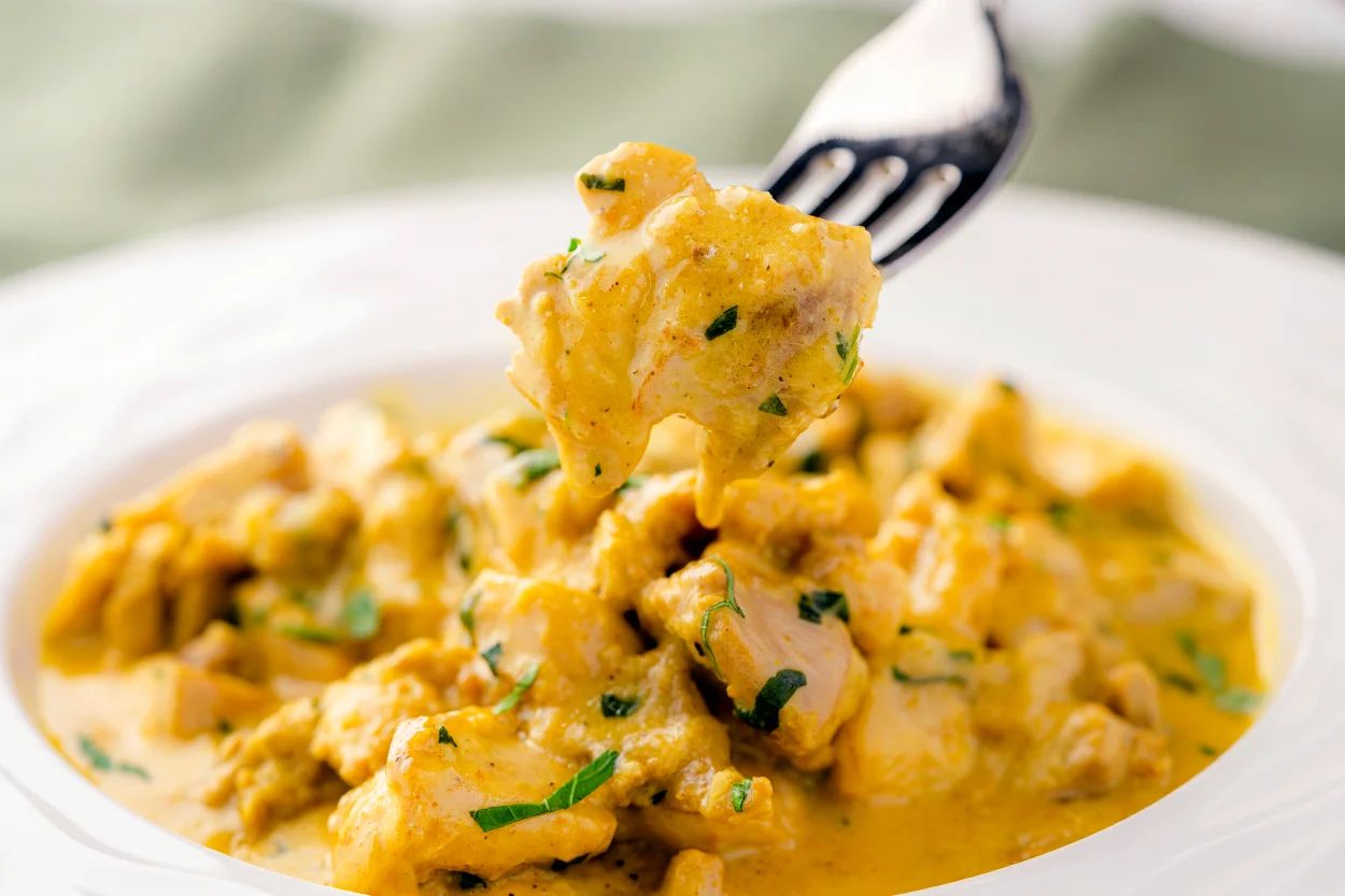 Sote edilmiş jülyen tavuk parçaları, kremalı köri sos, mantar, kırmızı ve yeşil biber, tereyağlı pilav, patates tava ile..
