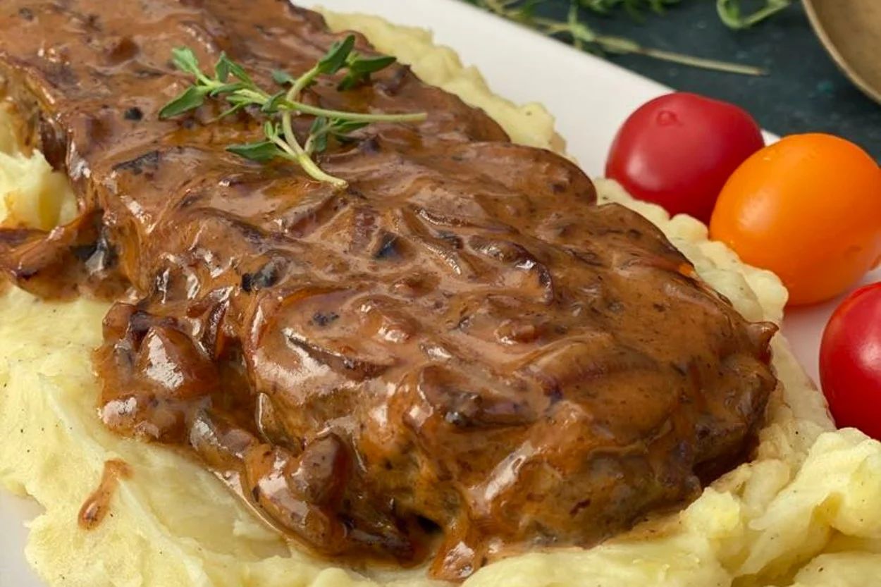 Fırında ağır ateşte pişmiş antrikot, dağ mantarı sosu, patates püresi ve sote sebze ile..