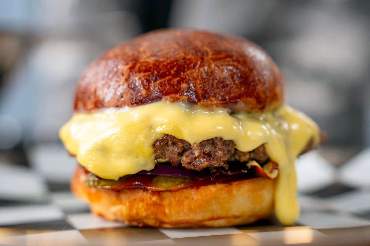 Ev Yapımı Hamburger Köftesi, Burger Sos, Karamelize Soğan, Cheddar Peyniri yanında Patates Kızartması ve Dip sos